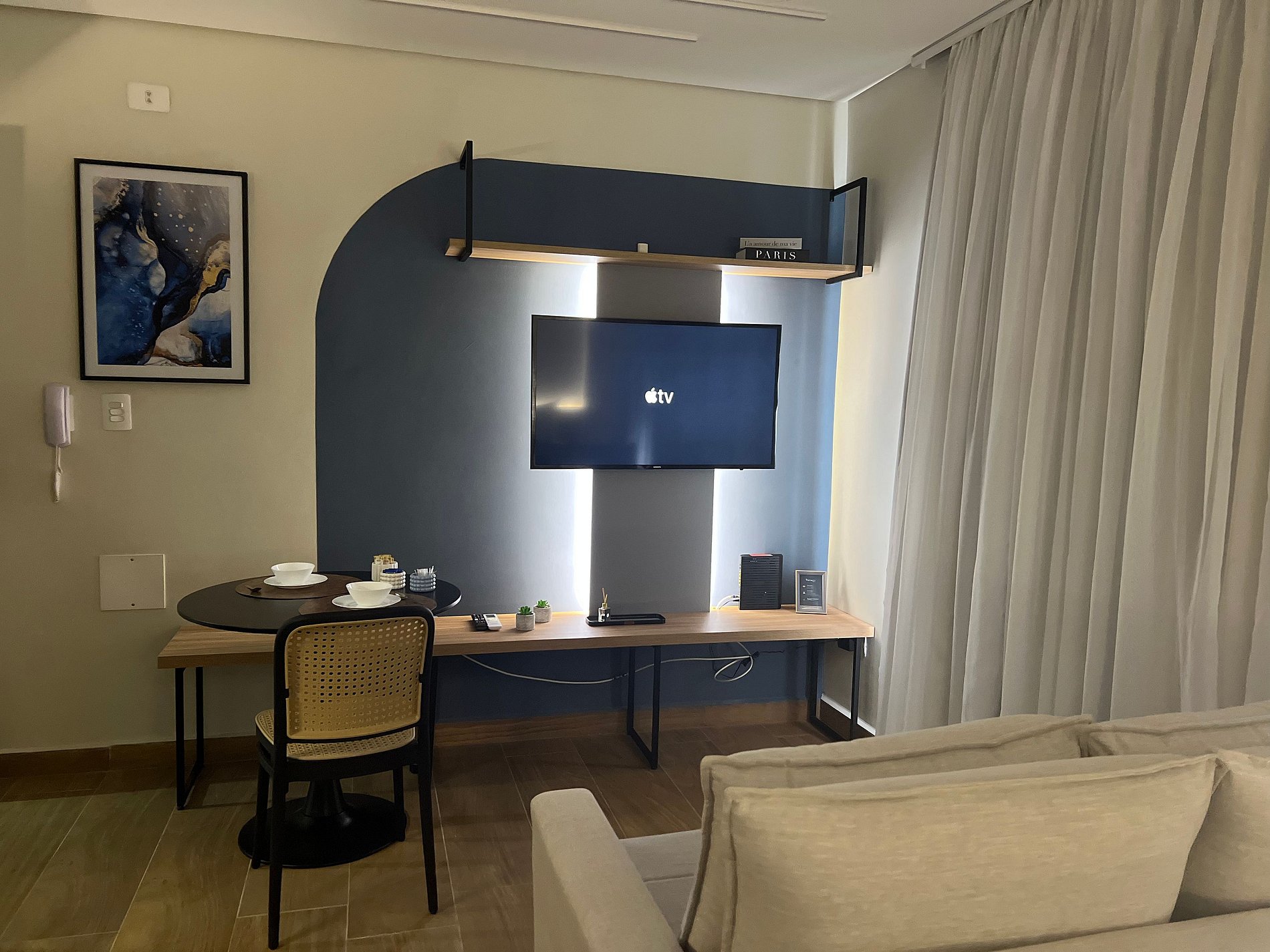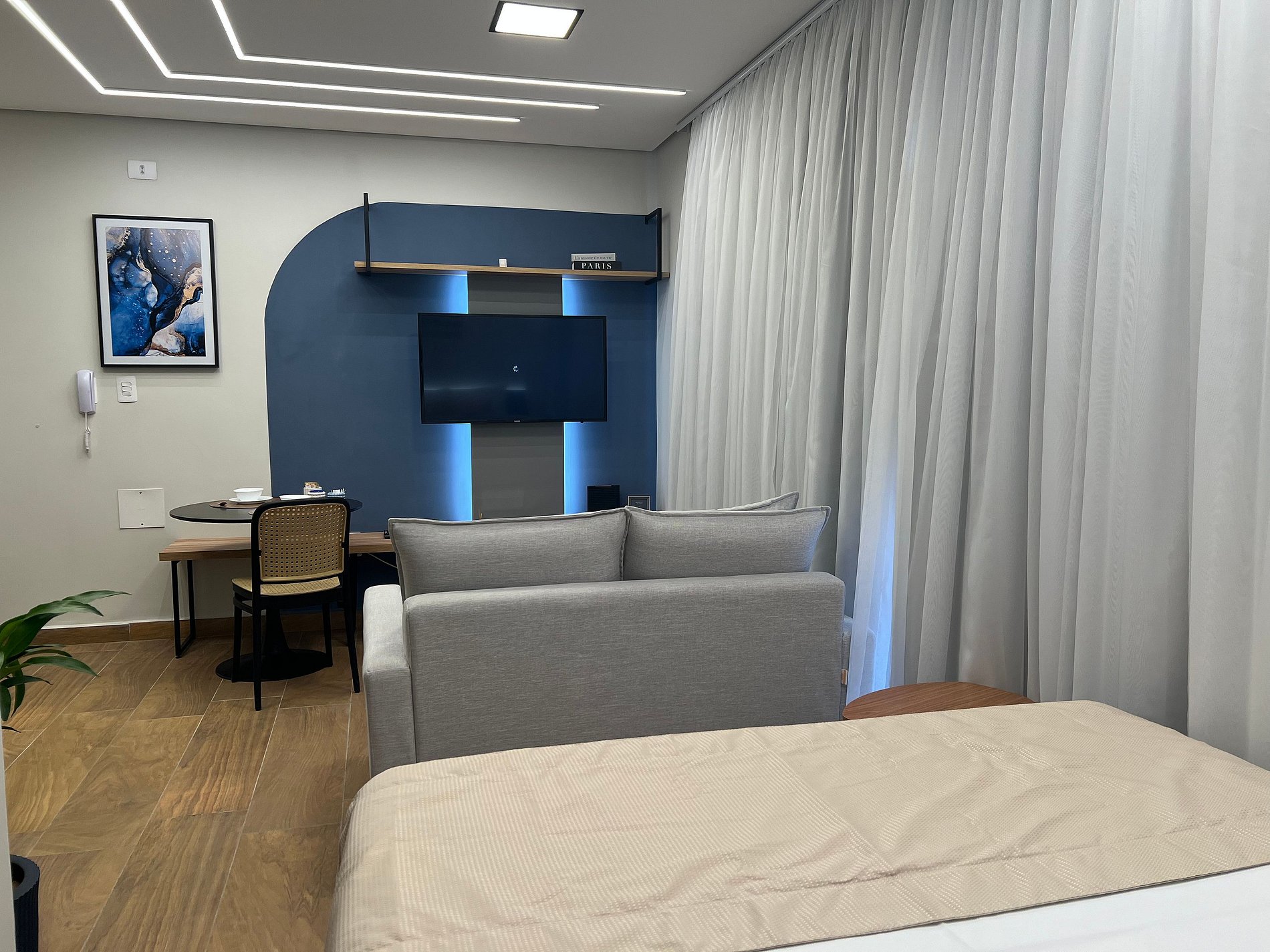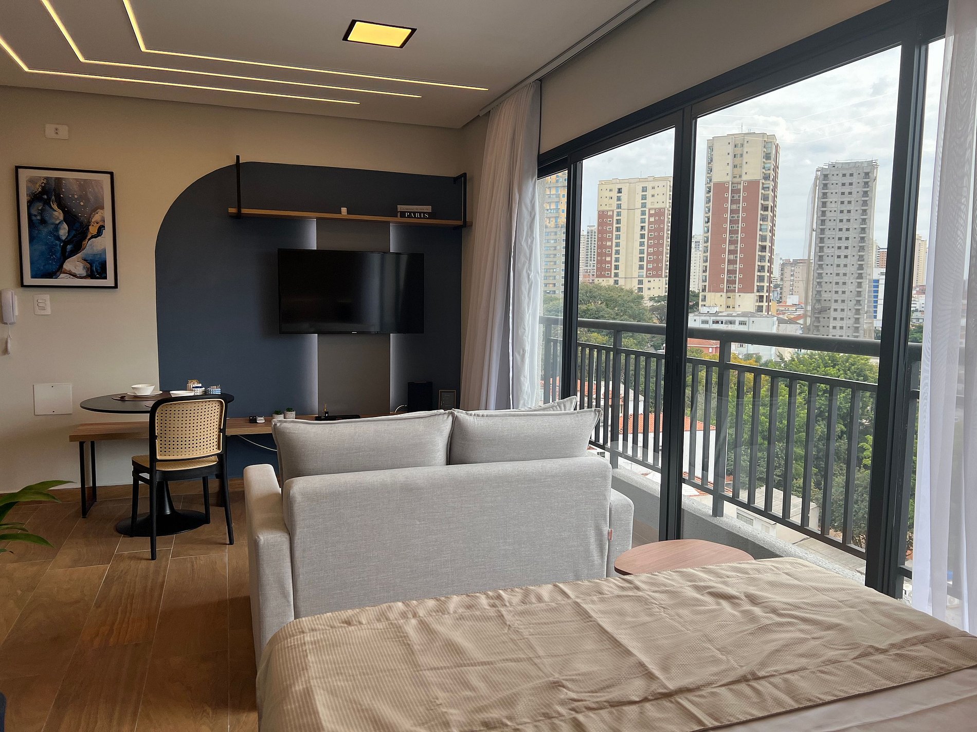 O apartamento conta com quarto aconchegante, cama confortável e banheiro privativo, criando o cenário perfeito para descansar após um dia intenso na cidade seja a trabalho, lazer ou eventos.