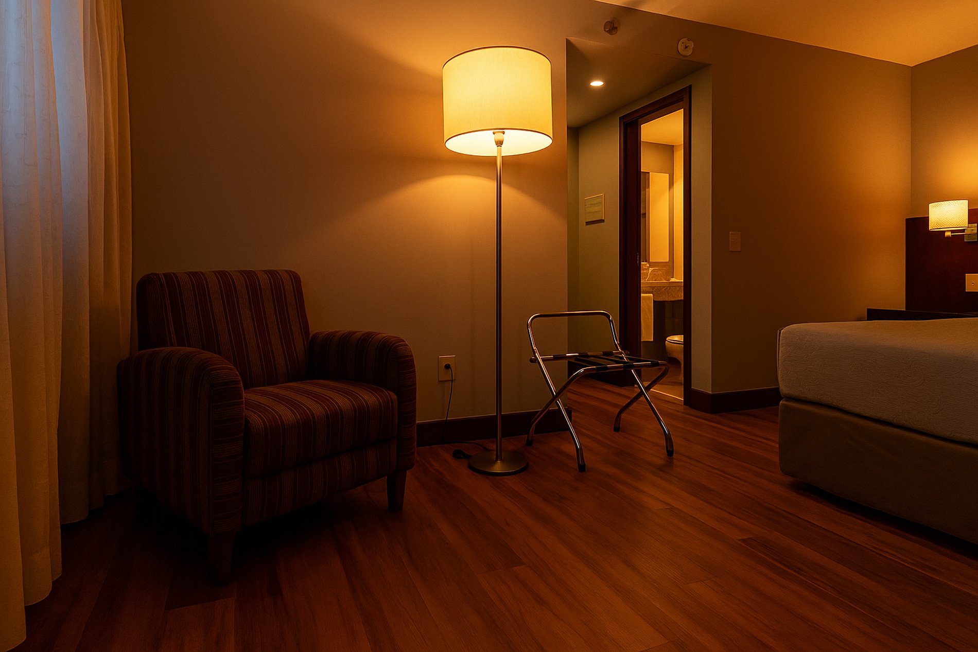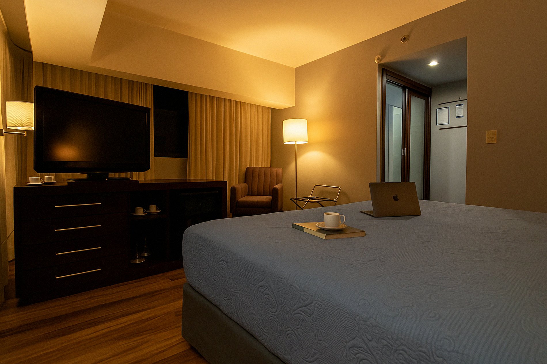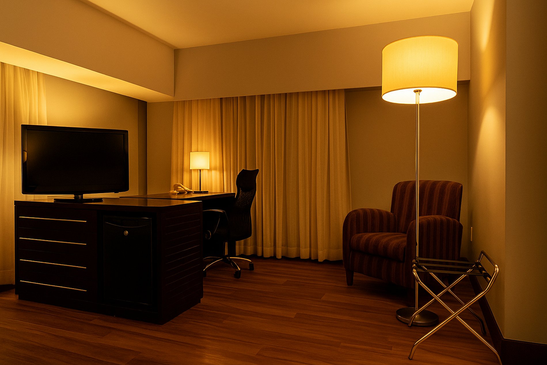 Ao entrar no quarto, o ar climatizado envolve você, proporcionando um ambiente agradável para relaxar ou trabalhar. O espaço é ideal para quem precisa de um local tranquilo e bem equipado para o home office, com uma TV estrategicamente posicionada para momentos de descontração entre uma tarefa e outra.